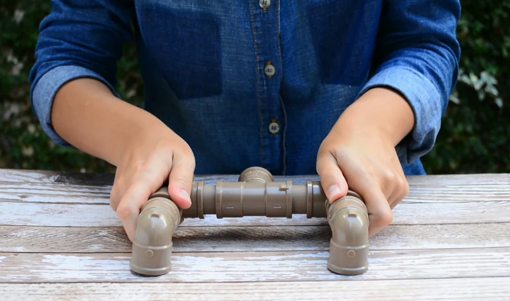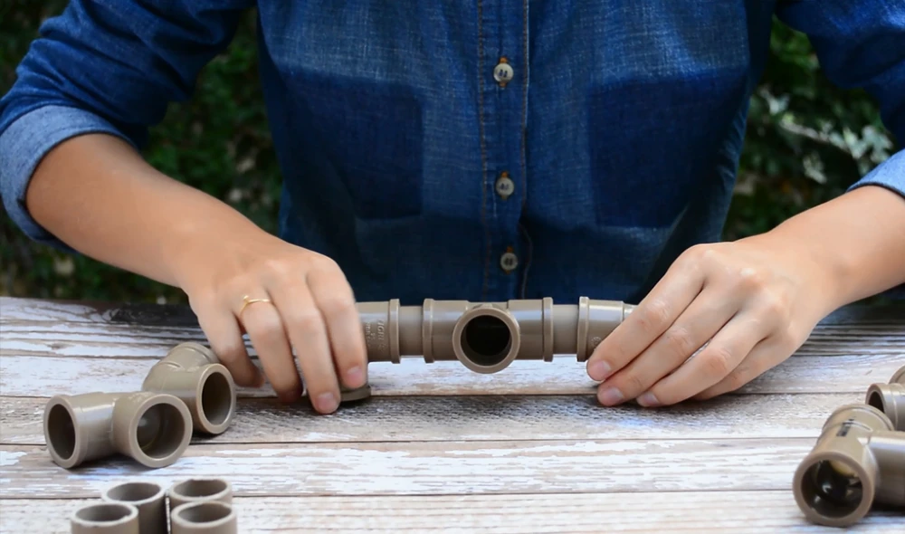 Passo 2: Iniciando pela base, encaixe os 4 joelhos de 90° aos 4 canos de 2cm. Então, una duas partes com um conector T e e as outras duas partes com outro conector T. Use outros 2 canos de 2cm para unir os pés a outro conector T.