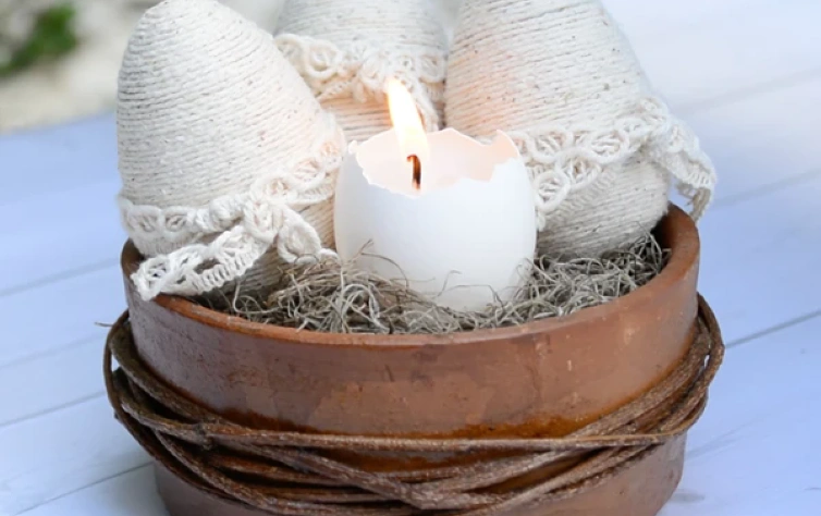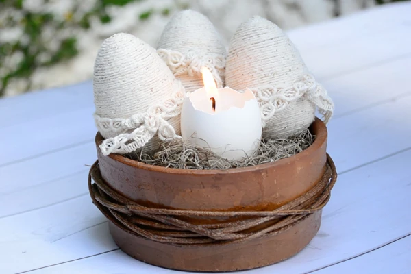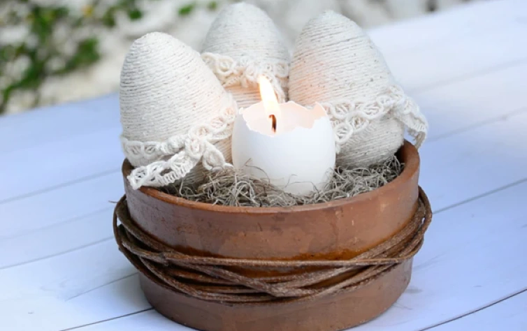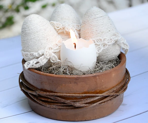 - Para dar um toque mais charmoso, amarre em volta do ovo uma renda de algodão ou outra fita que tenha em casa.