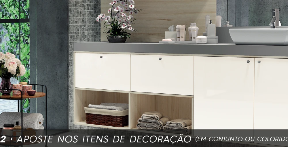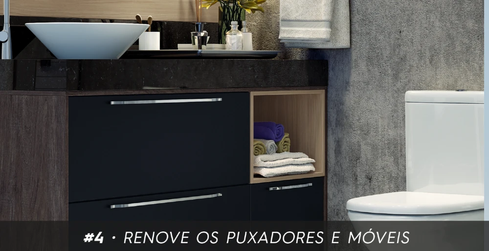 A melhor maneira de dar uma cara nova aos armários do banheiro sem fazer reforma é substituir os puxadores atuais por novos. Dessa forma, você consegue trocar totalmente o estilo do seu banheiro, indo do elegante para o rústico ou do clássico para o moderno. Antes de decidir em qual tipo de puxador você vai investir, é importante fazer uma avaliação do estilo do móvel, para não destoar. Vale também investir em algum móvel planejado um pouco mais neutro. Além de ser feito para aproveitar melhor o espaço do seu banheiro, ele acaba sendo mais versátil na hora de inovar na decoração.