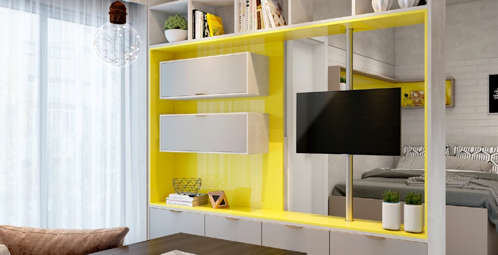 É importante a escolha de um mobiliário funcional, que ajude a manter a organização do ambiente, bem como um que tenha boa distribuição e não atrapalhe a circulação dos moradores. Armários aéreos e nichos cumprem os dois papéis! Além disso, são tendência na decoração.