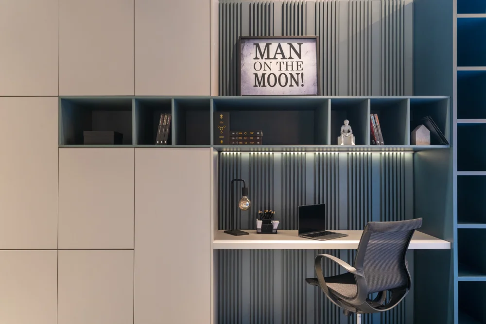 Ergonomia: a ergonomia é um elemento crucial para um local de estudo eficiente. Móveis planejados permitem que você projete uma mesa de estudo e cadeira na altura correta para evitar a tensão no pescoço, costas e olhos. Além disso, você pode projetar prateleiras e gavetas de fácil acesso para evitar esforços desnecessários.