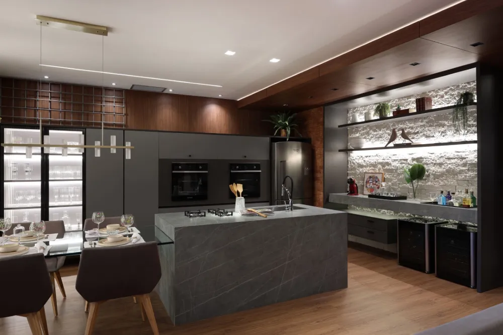 Dicas para armários e bancadas: armários em cinza ou branco combinam perfeitamente com bancadas de mármore ou granito escuro, trazendo um toque sofisticado ao espaço. Móveis planejados permitem otimizar o espaço da cozinha, unindo funcionalidade e estética.
