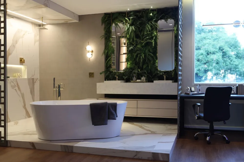 Os banheiros tendem a ser espaços menores, então é essencial escolher cores que ampliem visualmente o ambiente e transmitam frescor e limpeza.