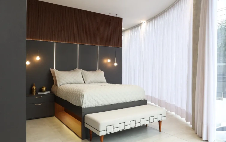 O quarto é um lugar de relaxamento, onde a luz desempenha um papel crucial. Uma iluminação bem planejada não apenas facilita atividades cotidianas, como ler, estudar e se vestir, mas também cria uma atmosfera aconchegante e relaxante para dormir ou descansar.