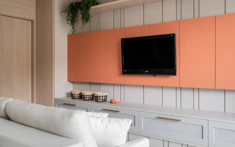 A pintura em laca é uma técnica de acabamento que envolve a aplicação de tinta no painel do móvel, proporcionando um resultado uniforme, liso e, dependendo da escolha, com brilho intenso ou acetinado. Ela é muito utilizada em móveis planejados de diferentes ambientes, como cozinhas, banheiros, salas e quartos, por seu apelo estético e toque de modernidade.
